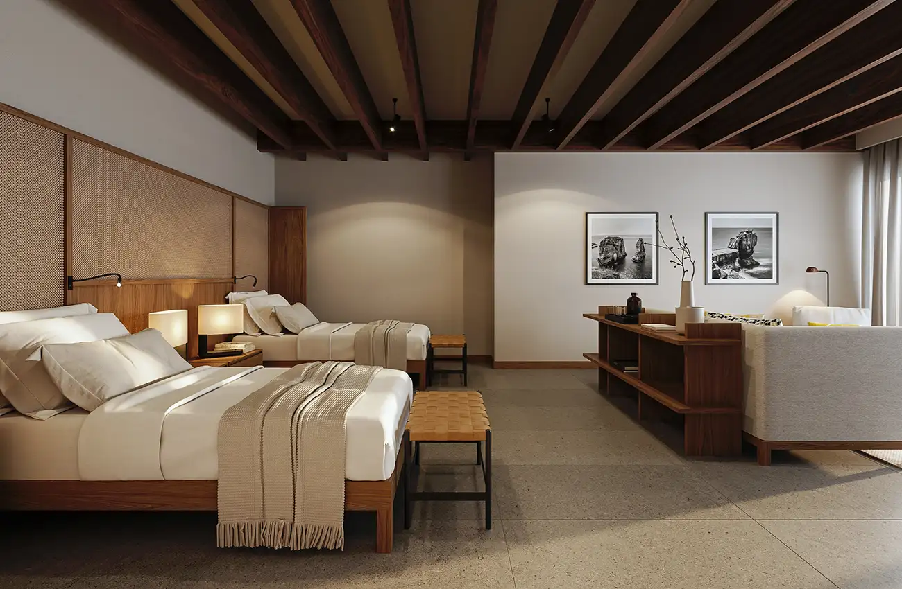 Tus clientes experimentarán habitaciones premium meticulosamente diseñadas en nuestras prestigiosas habitaciones Finch Bay Premium, donde nuestros huéspedes pueden relajarse en habitaciones con cama king, las cuales prometen una noche de descanso rejuvenecedor. Las habitaciones pueden ser convertibles o interconectadas, facilitando una transición fluida entre alojamientos para grupos grandes o familias.