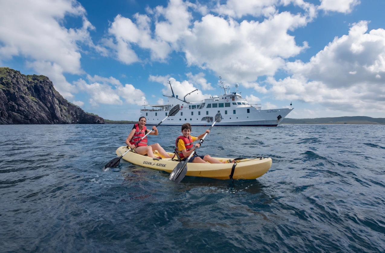 Yacht La Pinta offers a special and comfortable travel experience in the Enchanted Isles, with cabins that provide your clients with ample space, comfort, and spectacular views of the Galapagos Islands’ unique landscapes. The ship’s modern feel extends to its hot tub, cardio gym, and sundeck. Land and aquatic activities, from hiking and coastal exploration to kayaking, snorkeling, and even paddleboarding, are complemented by a glass-bottom boat option for curious guests wishing to remain dry.